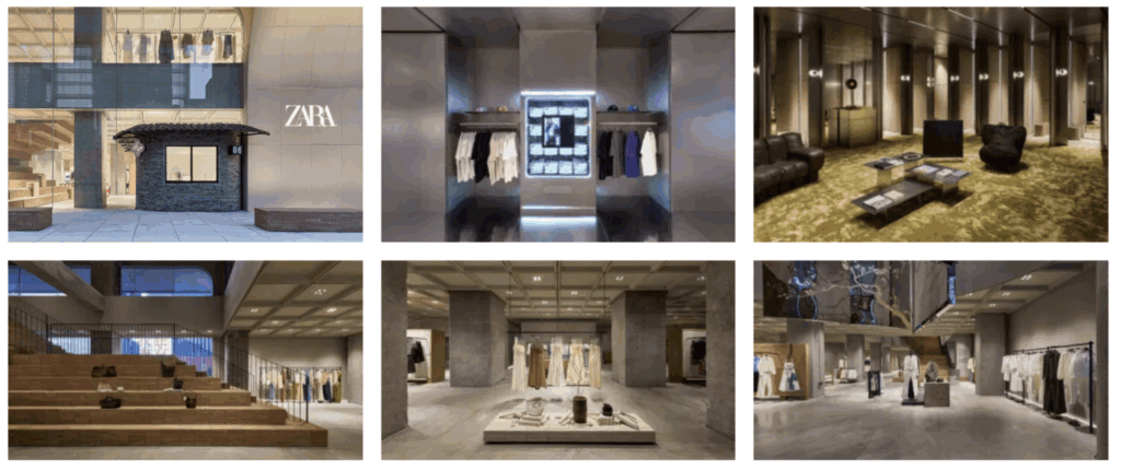 南京旗艦店は2階建てで、外観は均一なグレーのセメント調の素材で覆われている。内装も工業的な石造りと濃い木目調のテクスチャーで統一されている。この店舗には、アジア初のZARA自動コンベヤーシステムや、世界初の「ZARAサロン」が導入され、完全なラグジュアリー体験を提供するために予約制のパーソナライズドスタイリングサービスを提供している。また、初の「自撮りポッド」フォトブースやアパレル自動販売機も設置されている。