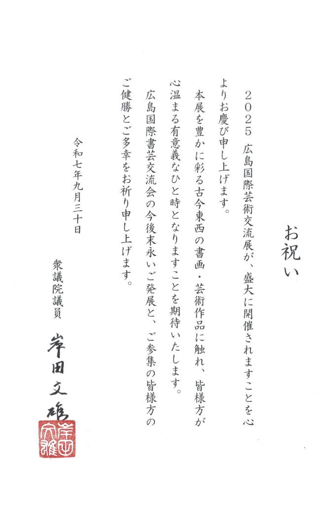式典では、広島市議会議員の平岡優一氏が挨拶を述べ、広島国際書芸交流会の石川真由美常務理事長兼事務局長が来賓を出迎えました。