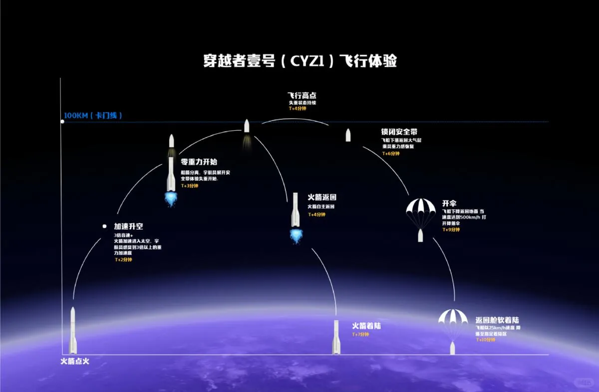 今回公開された「穿越者1号(CYZ-1)」は、地上100kmの「カーマン・ライン(宇宙の境界線)」まで到達するサブオービタル(弾道飛行)用の宇宙船です。乗客は約3分から6分間の無重力状態を体験し、漆黒の宇宙を背景に輝く地球の輪郭を眺めることができます。