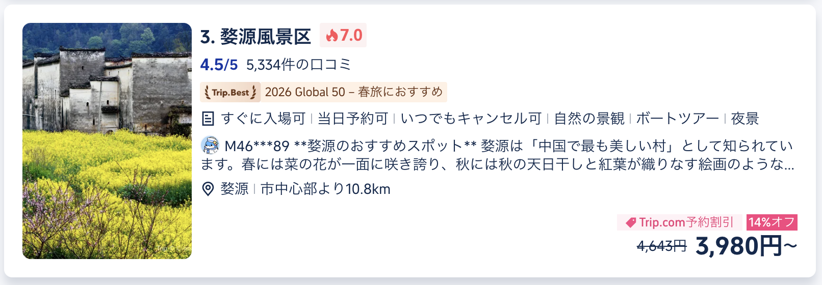 • 篁嶺(こうれい)景区: 山間の集落。秋に家のバルコニーに農産物を干す「晒秋」や春の菜の花が有名。