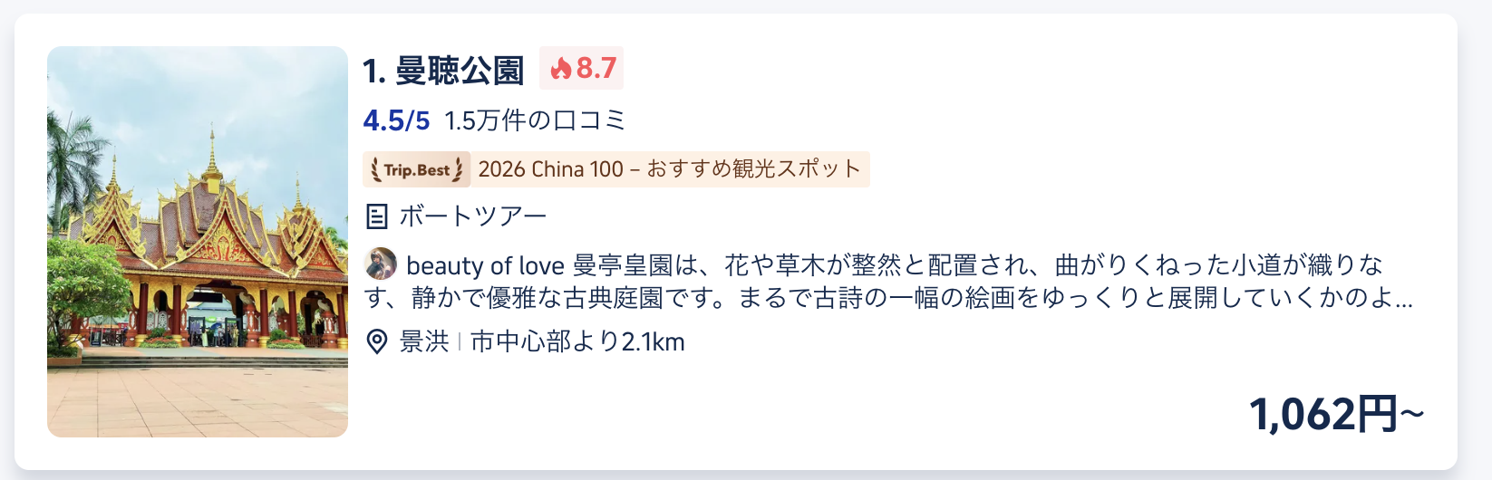• 告庄西双景(ガオジューアン・シーシュアンジン): 景洪大金塔(パゴダ)と星光夜市(ナイトマーケット)が広がる、最も賑やかなエリア。