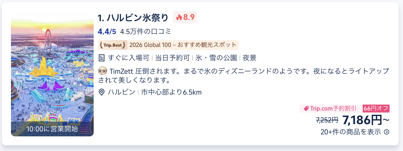 • ハルビン氷雪大世界: 毎年12月下旬〜2月下旬開催。巨大な氷の彫刻や滑り台があり夜のライトアップは圧巻の光景。