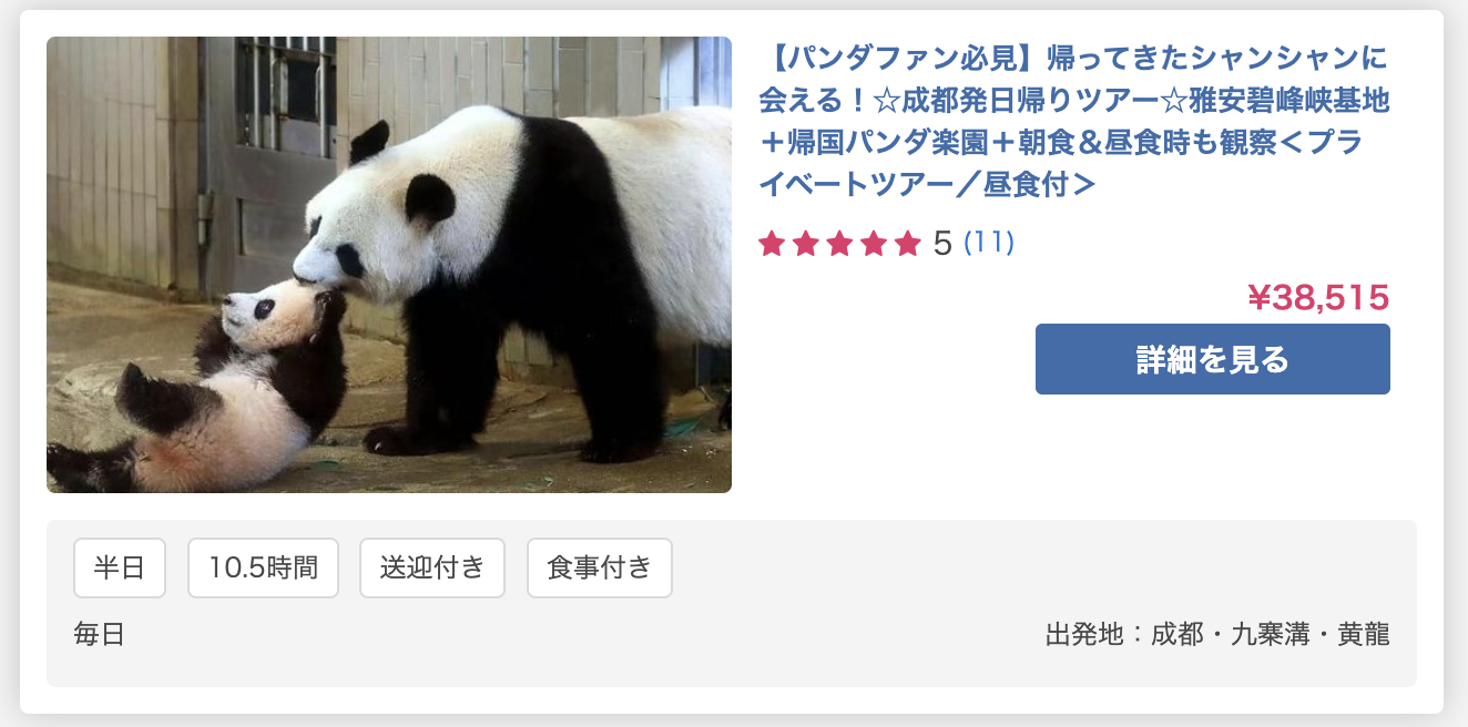 現地までのアクセスが不安という方には日帰りツアーがおすすめです。お値段は少々高めですが成都市内からの送迎やチケット、ランチもセット。専用車と日本語ガイド付きなので安心感バツグンです。