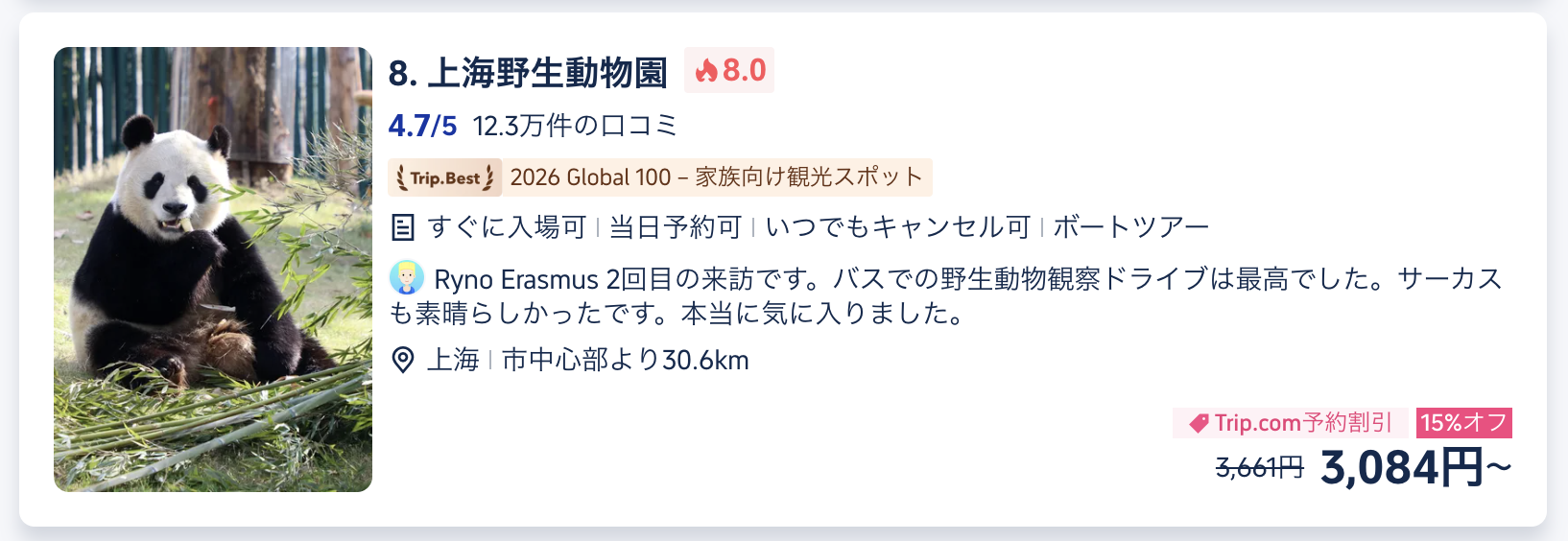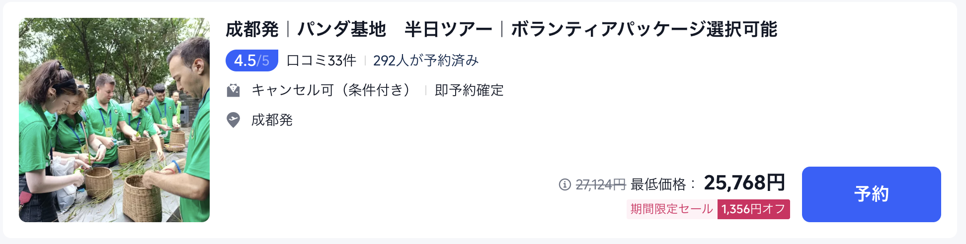 入場チケットはTrip.comから早めの購入がおすすめです。パンダが最も活発に動くのは朝9時頃で、特に暑い季節は午後になると屋内に移動し寝てしまうことが多いため、特に午前券はすぐに売り切れてしまいます。