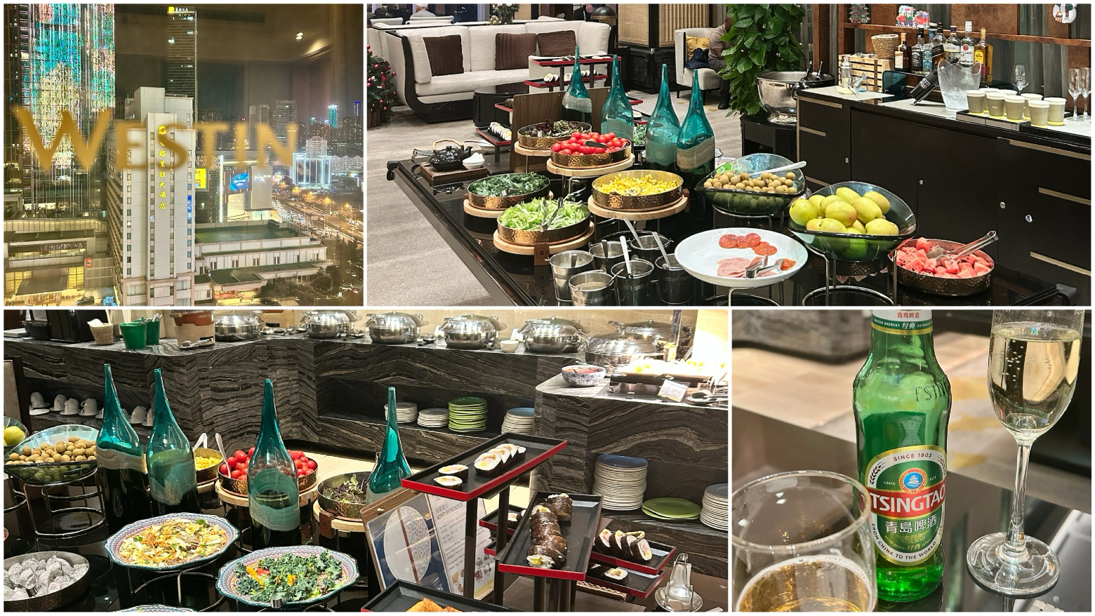 ウェスティン青島で特に印象的だったのがエグゼクティブラウンジ(通称クラブラウンジ)。14:00〜16:00のティータイムではお茶菓子が、17:30〜19:30のイブニングタイムではオードブルやフルーツ、シャンパン、ワイン、青島ビールなどが提供されます。特にイブニングタイムは内容が豊富で大満足でした。