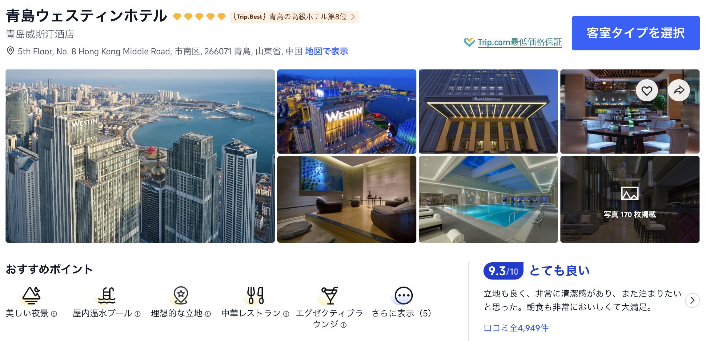 青島の中心部に位置するウェスティン青島は、地下鉄3号線五四広場駅から徒歩すぐ(空港から地下鉄利用で最寄駅まで約15分)。近くのエリアにはミックスシー ショッピング モール、五四広場やオリンピックセーリングセンターなどがあり、観光にも大変便利な立地にあります。朝食の種類が豊富なのも好評です。