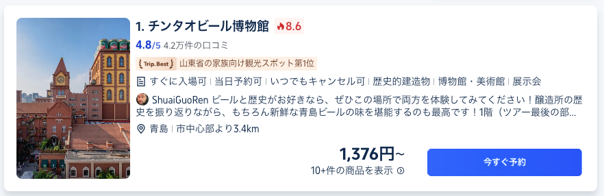 青島ビールの歴史と製造工程を学べる博物館です。試飲コーナーでは工場直送の新鮮な青島ビールを飲み比べることもでき、ビール好きにはたまらないスポット。お土産コーナーも充実しています。チケットはオンライン予約が便利。予約時は実名登録が必要で、当日は入り口でパスポートチェックがあります。
